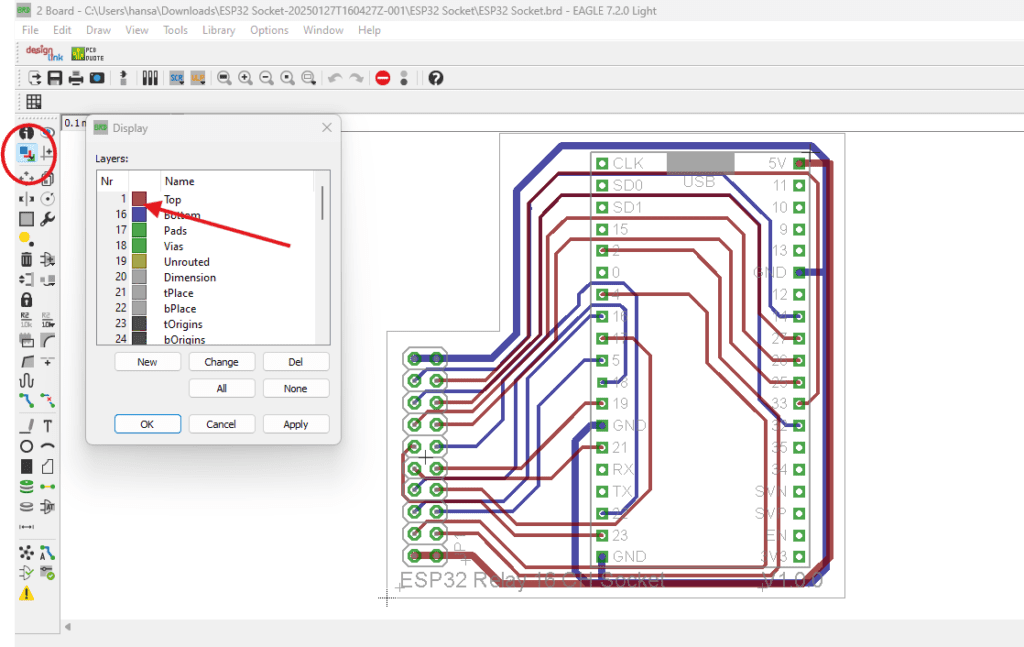 - Untuk ekspor yang lebih spesifik, Anda bisa memilih layer tertentu sesuai kebutuhan, seperti Top Copper, Bottom Copper, Pads, dan Silkscreen untuk tampilan yang lebih jelas.