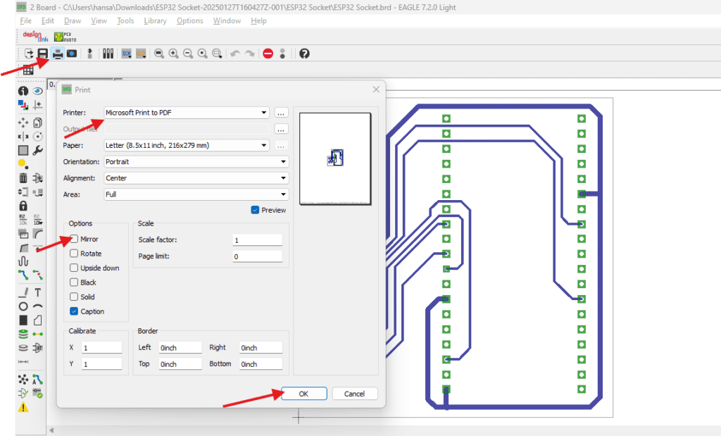 - Sesuaikan scale (skala) untuk memastikan desain ditampilkan dengan ukuran yang sesuai. Anda bisa menggunakan pengaturan skala 1:1 untuk ukuran asli PCB atau skala lain jika diperlukan.