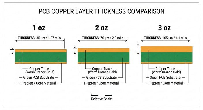 Sebagai gambaran: 1 oz tembaga setara dengan ketebalan sekitar 35 mikrometer atau 0,035 mm. Itu tipis banget, bahkan lebih tipis dari sehelai rambut manusia. Untuk keperluan yang butuh arus lebih besar, digunakan 2 oz (±70 µm) atau bahkan 3 oz ke atas.