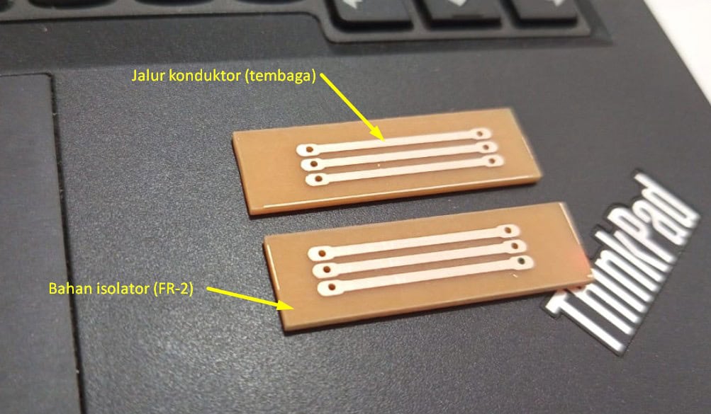 PCB biasanya dibuat dari bahan dasar seperti pertinaz (FR-2), fiberglass (FR-4), resin, atau material khusus lain yang bersifat isolator. Di atas bahan ini, lapisan tembaga ditempel dan kemudian dietsa membentuk jalur rangkaian sesuai desain. Komponen seperti resistor, kapasitor, transistor, dan IC kemudian dipasang melalui proses soldering. Hasil akhirnya adalah satu kesatuan rangkaian yang kuat, stabil, dan tahan lama.